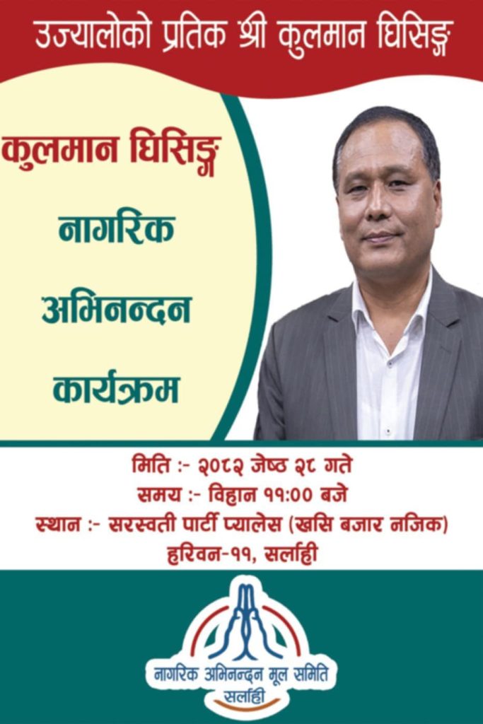 नागरिक अभिनन्दन मूल समिति, सर्लाहीको आयोजनामा घिसिङलाई समर्पित “नागरिक अभिनन्दन कार्यक्रम” यही जेठ २८ गते, बिहान ११:०० बजे, हरिवन–११, सर्लाहीस्थित सरस्वती पार्टी प्यालेस (खसी बजार नजिक) मा आयोजना हुँदैछ।